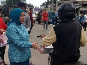 WARTASERUNDINGAN.COM – Ketua Pemberdayaan Kesejahteraan Keluarga (PKK) Kabupaten Musi Rawas Utara (Muratara), Hj. Rita Suryani, bersama anggota PKK Muratara, menggelar aksi sosial dengan membagikan takjil kepada para pengemudi yang melintas di Jalan Lintas Sumatera. Kegiatan ini berlangsung di Simpang Empat Karang Dapo, Kelurahan Muara Rupit, Kecamatan Rupit, pada Rabu (12/03/2025) sore.